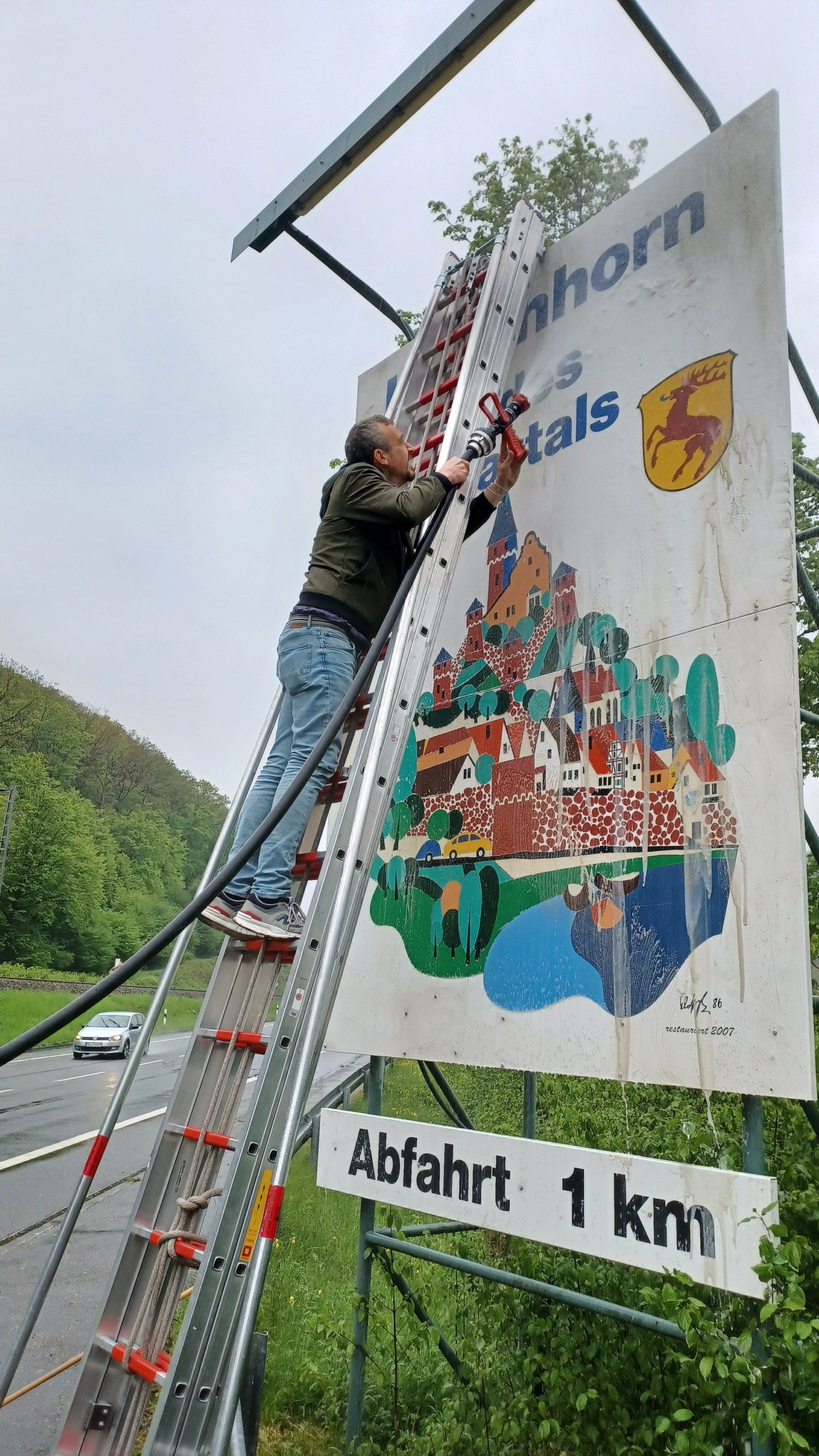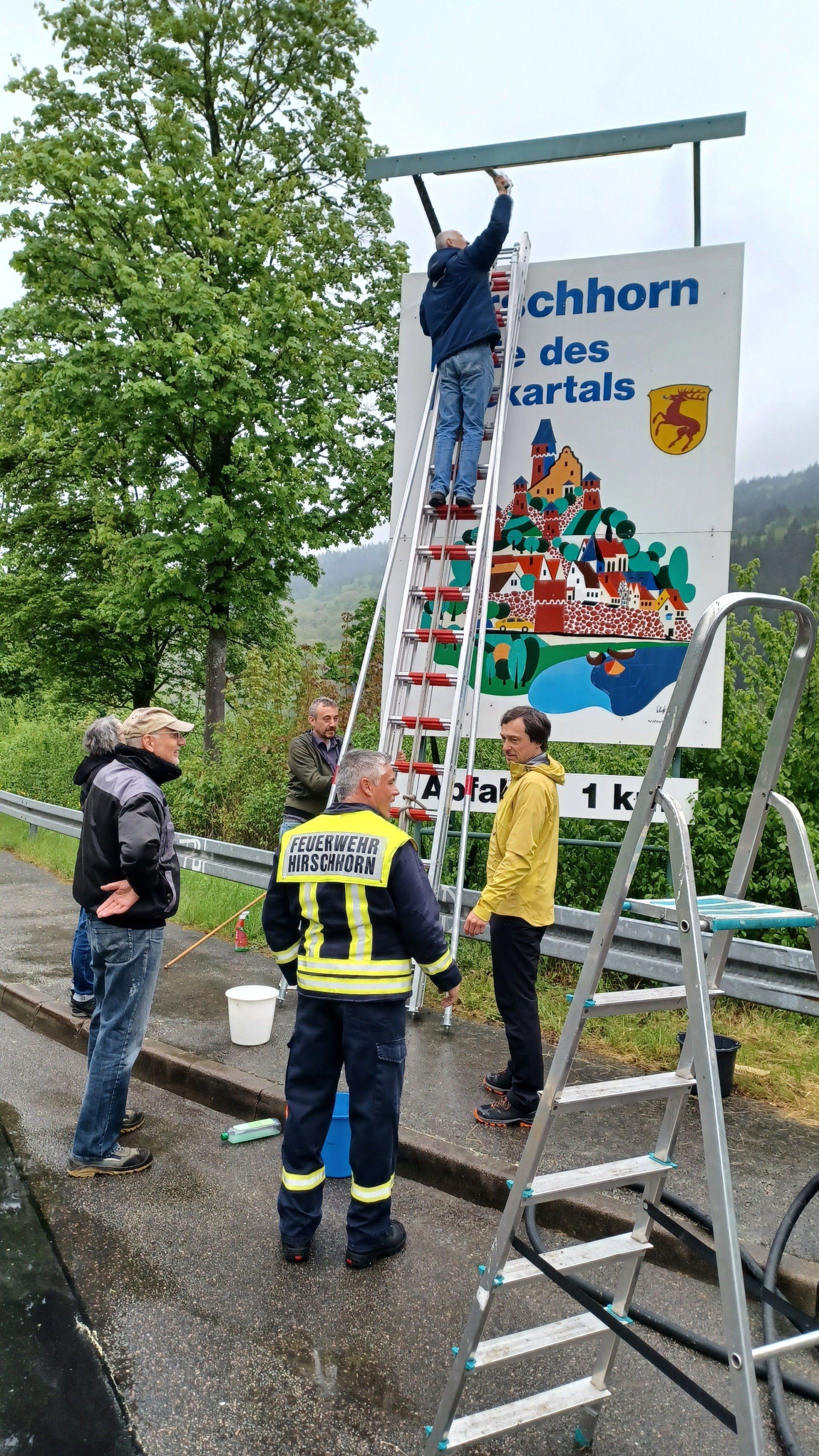 Das Hinweisschild des kürzlich verstorbenen Hirschhorner Künstlers Karl-Heinz Schaffarczyk, das einen Kilometer vor dem Ortseingang Besucher auf unser schönes Städtchen aufmerksam macht und Bewohnern signalisiert, gleich zu Hause zu sein, wurde am Samstag, 6. Mai durch Profil Hirschhorn mit tatkräftiger Unterstützung der Feuerwehr gesäubert.