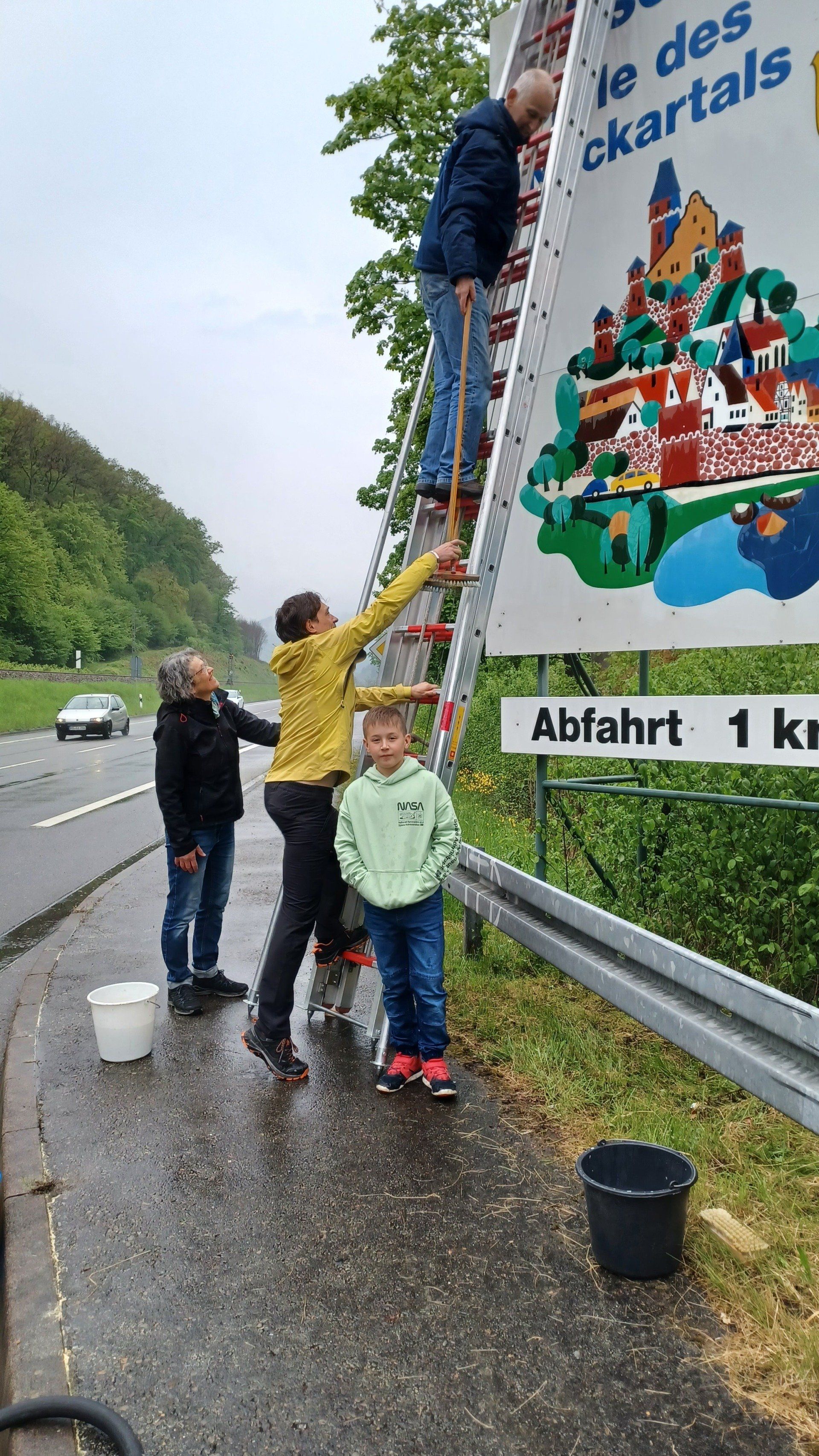 Profil hat es sich vor Jahren zur Aufgabe gemacht das an der Kläranlage stehende Hinweisschild „Hirschhorn“, gestaltet von Karlheinz Schaffarczyk, immer wieder zu reinigen. Es war wieder an der Zeit. Am vergangenen Samstag hat sich eine Gruppe – trotz Regen - auf den Weg gemacht und mit Unterstützung der Feuerwehr Hirschhorn durch Stadtbrandinspektor Marco Albert, an die Arbeit zu gehen. Versorgt mit Leitern, Wasser und Reinigungsmitteln wurde die Anlage wieder auf Hochglanz gebracht.